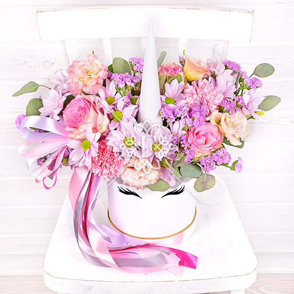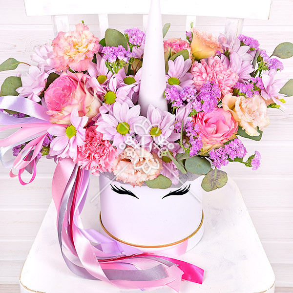 Словно волшебный единорог с роскошной гривой из роз, хризантем, гвозик, эустомы и статицы, эта цветочная композиция подарит сказочно-прекрасное настроение, искренний восторг и веру в чудеса!  Фиолетово-розовая гамма, нежность лепестков и  очарование бутонов  никого не оставят равнодушным!
