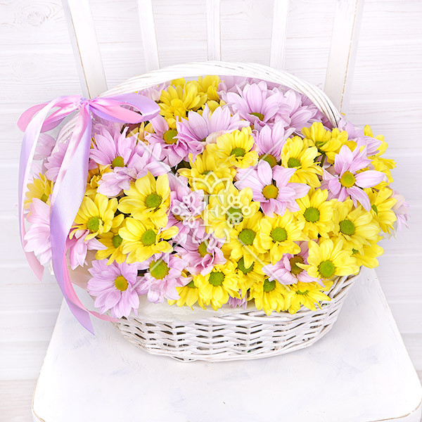 Хризантемы желтого и розового оттенков, уютно разместившись в плетеной корзинке, выглядят нежно и привлекательно!