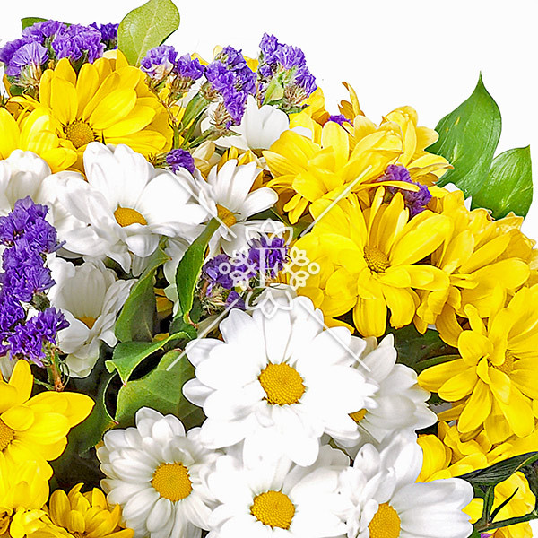 В букете использованы кустовые хризантемы белого и желтого цвета, а так же фиолетовые акценты статицы. Цветы считаются стойкими, и при правильном, незатейливом уходе будут радовать долгое время. Букет будет достаточно пышным даже в минимальной комплектации, а яркость оттенков разбавит красками любой, даже дождливый день.